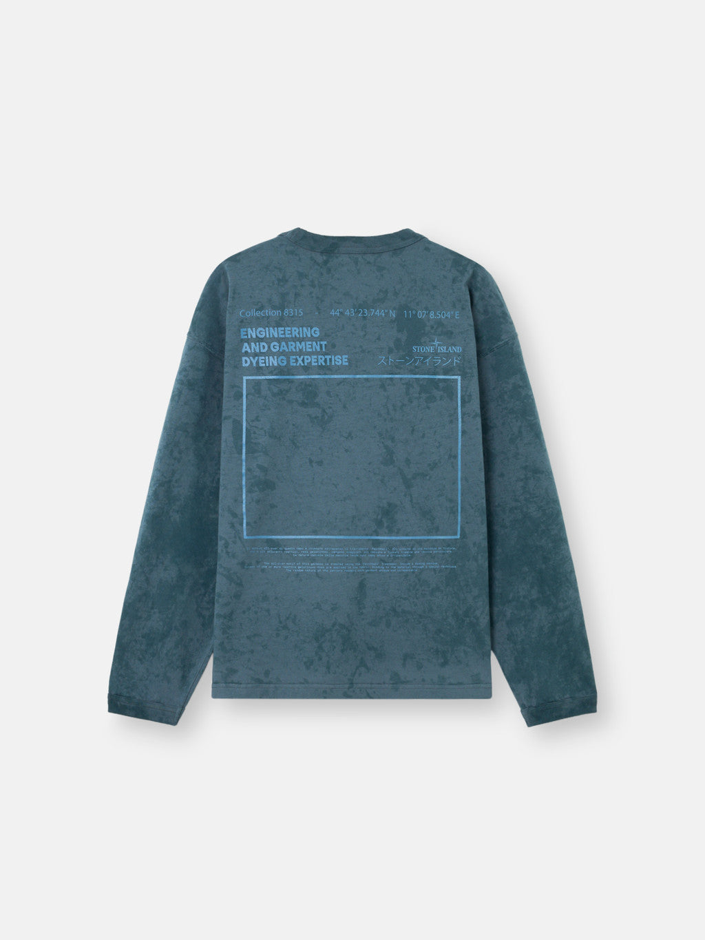 Long-sleeve T-shirt in combed organic cotton jersey with ¡®Empty Frame¡¯ print and all-over motif created using the ¡®Paintball¡¯ treatment. Inside a dyeing machine, bursts of one or more reactive gelatinous dyes are applied to the fabric, binding to the material through a special technique. The random nature of the pattern renders each garment unique and unrepeatable.
