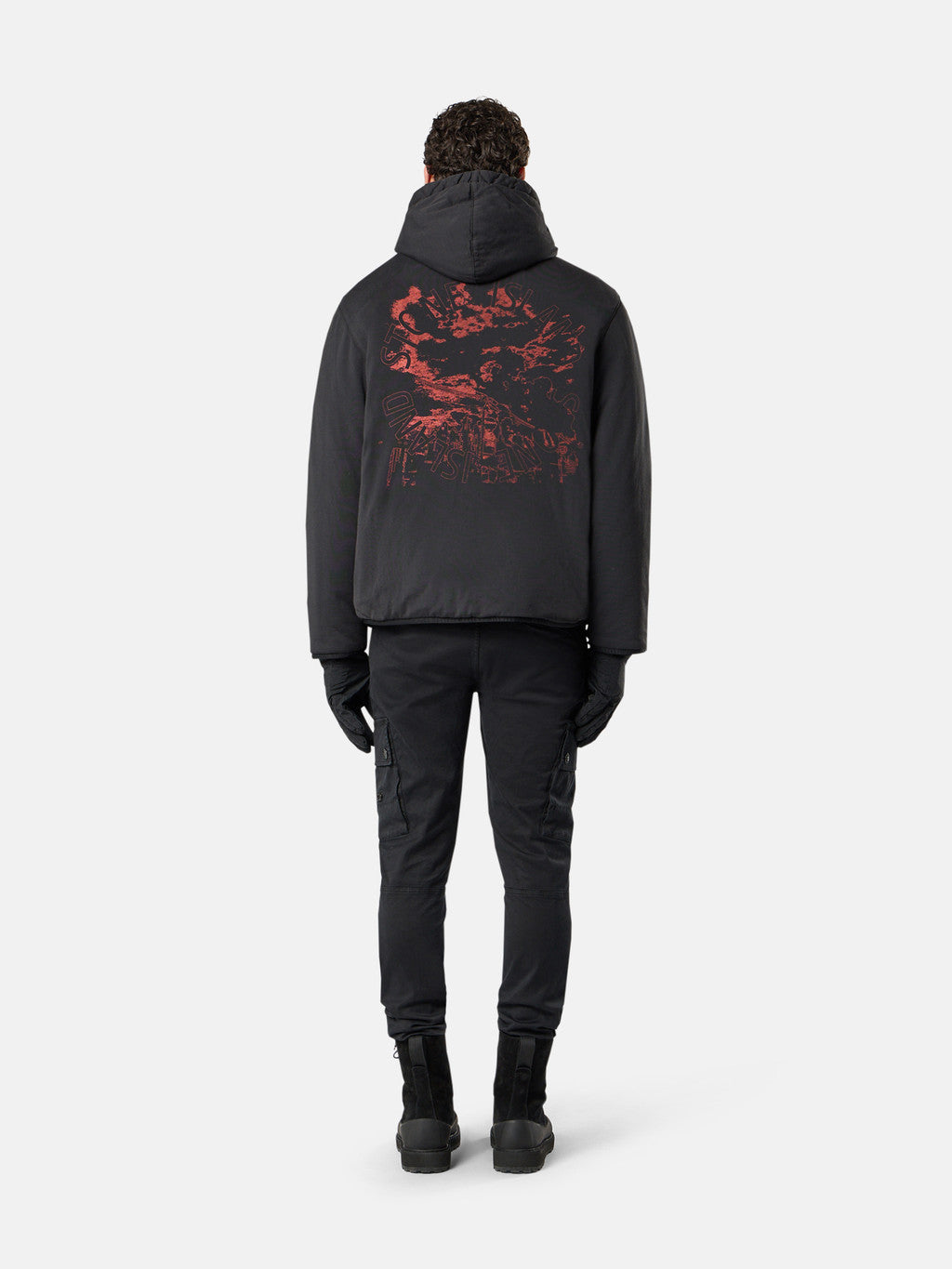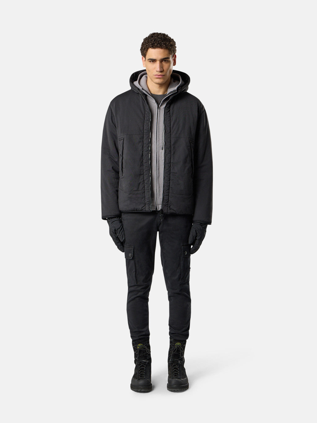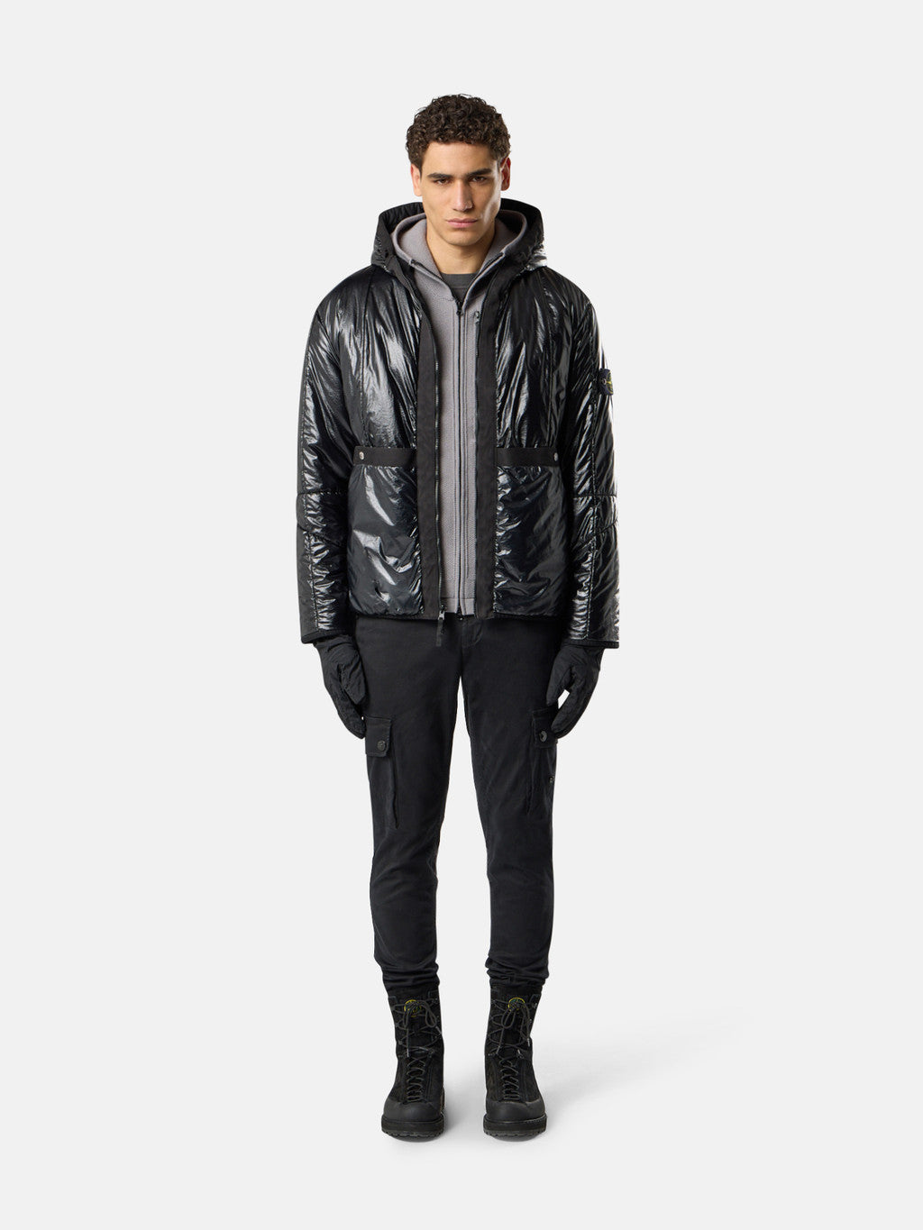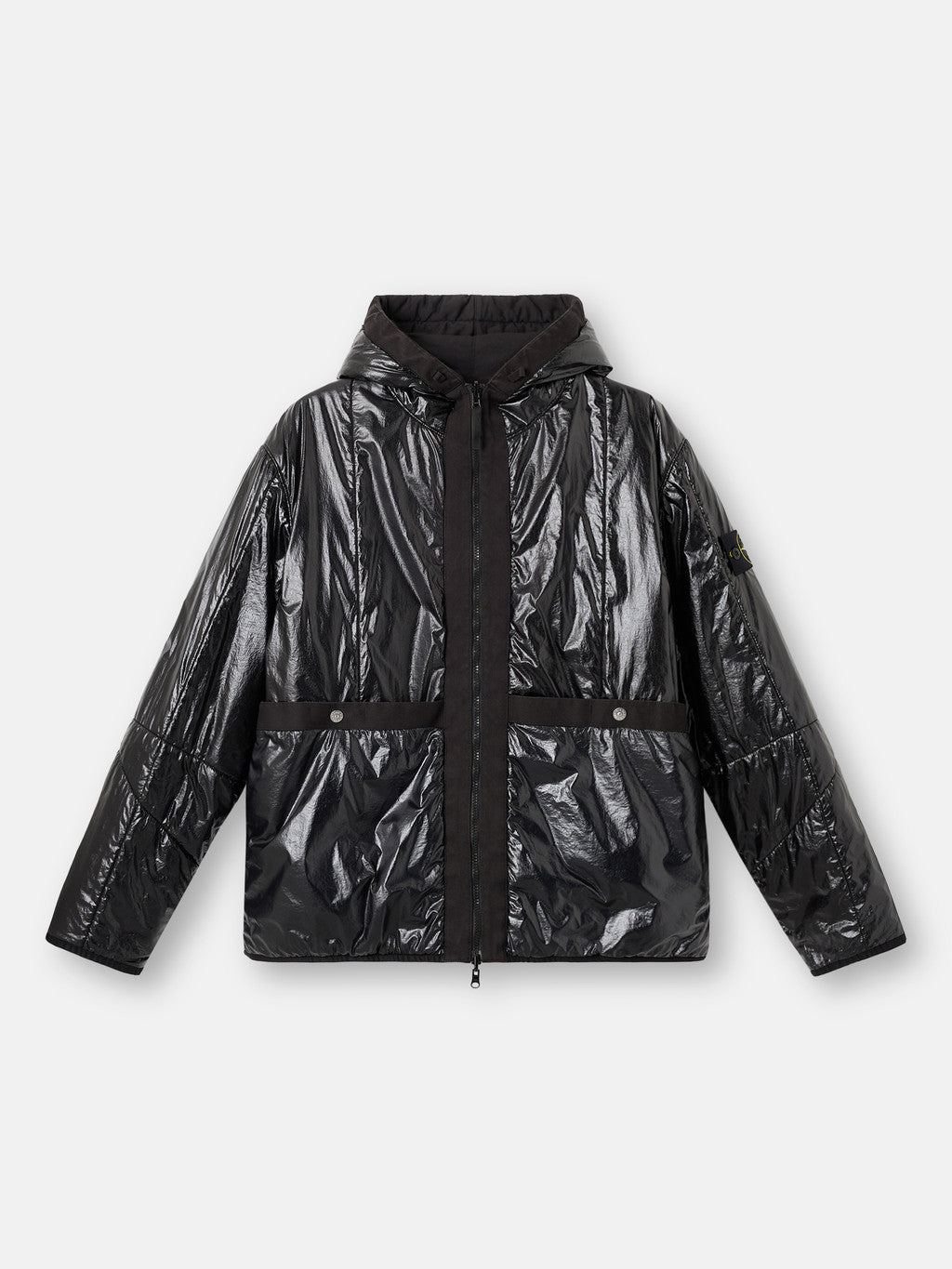 Reversible hooded jacket. On one side, compact jersey composed of mako cotton and nylon and on the other, nylon coated with a glossy polyurethane resin. Garment dyed with a double colour recipe.