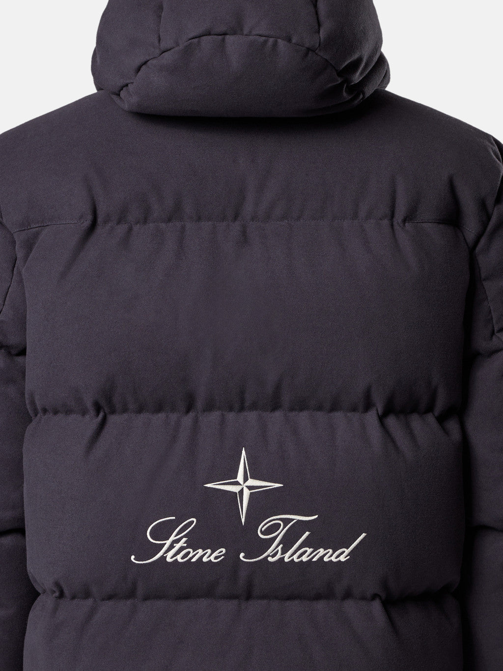 Hooded down jacket made from a cotton moleskin. The fabric's double-faced satin weave is brushed and sheared externally to achieve a warm and velvet-like hand. The fabric is resin-treated with a special anti-drop agent, making it wind resistant and mildly water resistant. RDS - Responsible Down Standard certified.