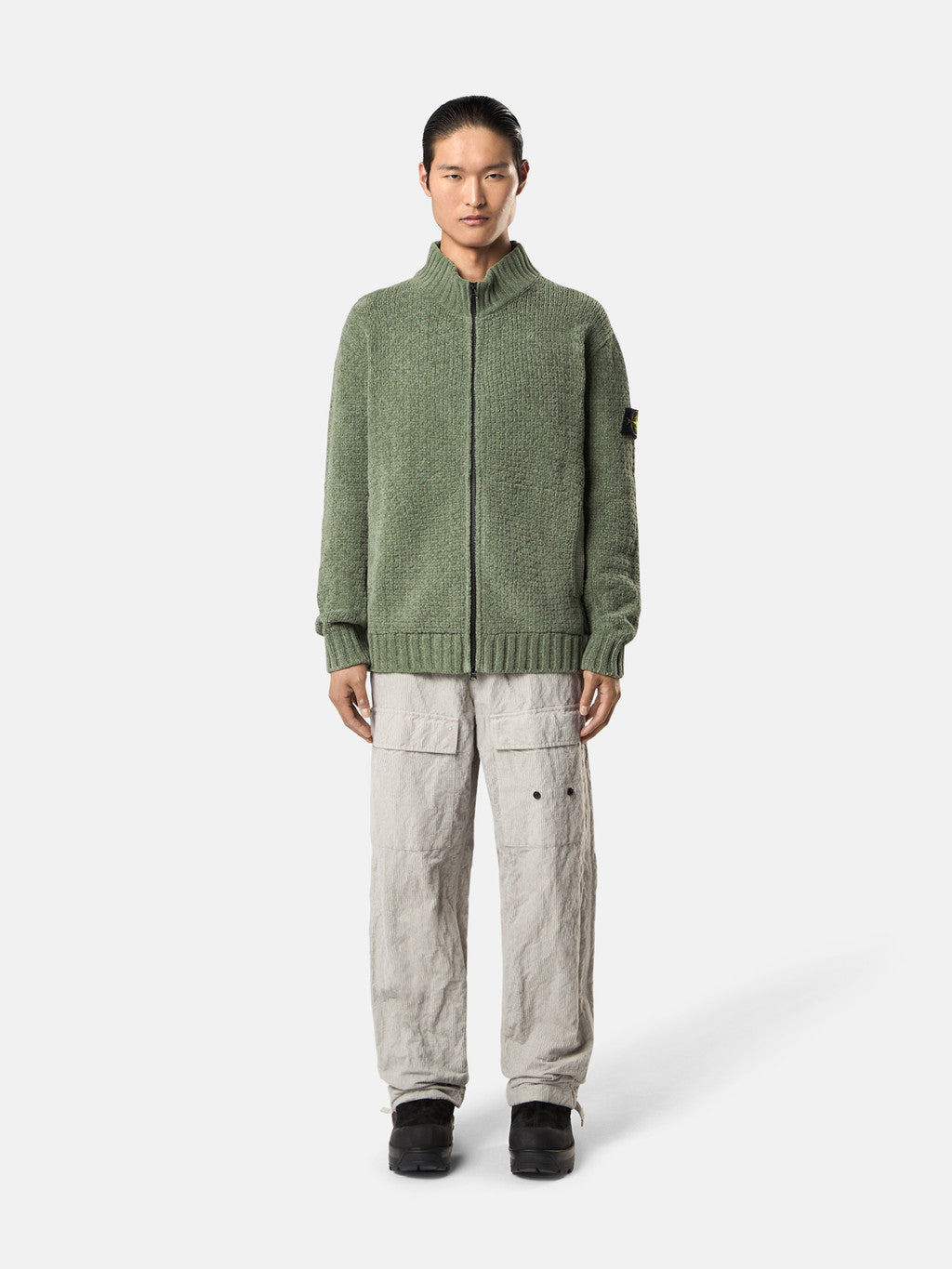 Knit zip-up jumper in cotton chenille. Reverse bobble stitch. Gauge 3.