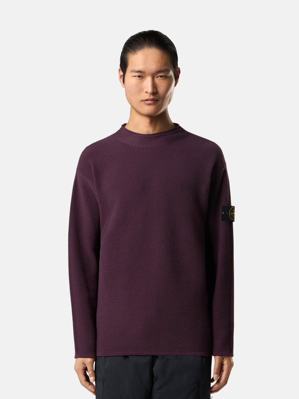 Knit mock neck jumper in cotton-nylon blend. Moss stitch. Gauge 7.