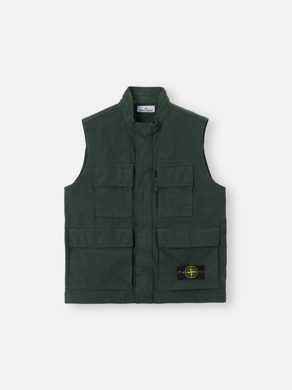 Utility vest in organic canvas weave cotton. The garment dyeing procedure with specific recipes and the addition of an anti-drop agent lends a unique appearance to the piece.