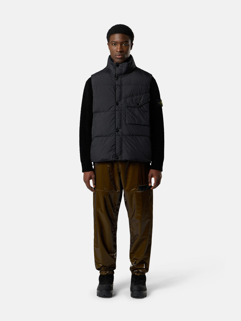 Down vest in a 100% recycled light nylon rep with an ultra-tight weaving construction. The resin coating of its inner face makes it wind resistant and mildly water resistant. The finished piece has been filled with the finest down specifically treated to withstand the garment dyeing procedure. Extra lightness and comfort are achieved through the direct injection of the feathers and by a simplified construction of the down bags. Due to the resin treating of the material, the colour penetrates unevenly into the material, lending a crinkle aspect to the surface. The addition of a special PFC free agent to the dye formula makes the piece anti-drop. RDS - Responsible Down Standard certified.
