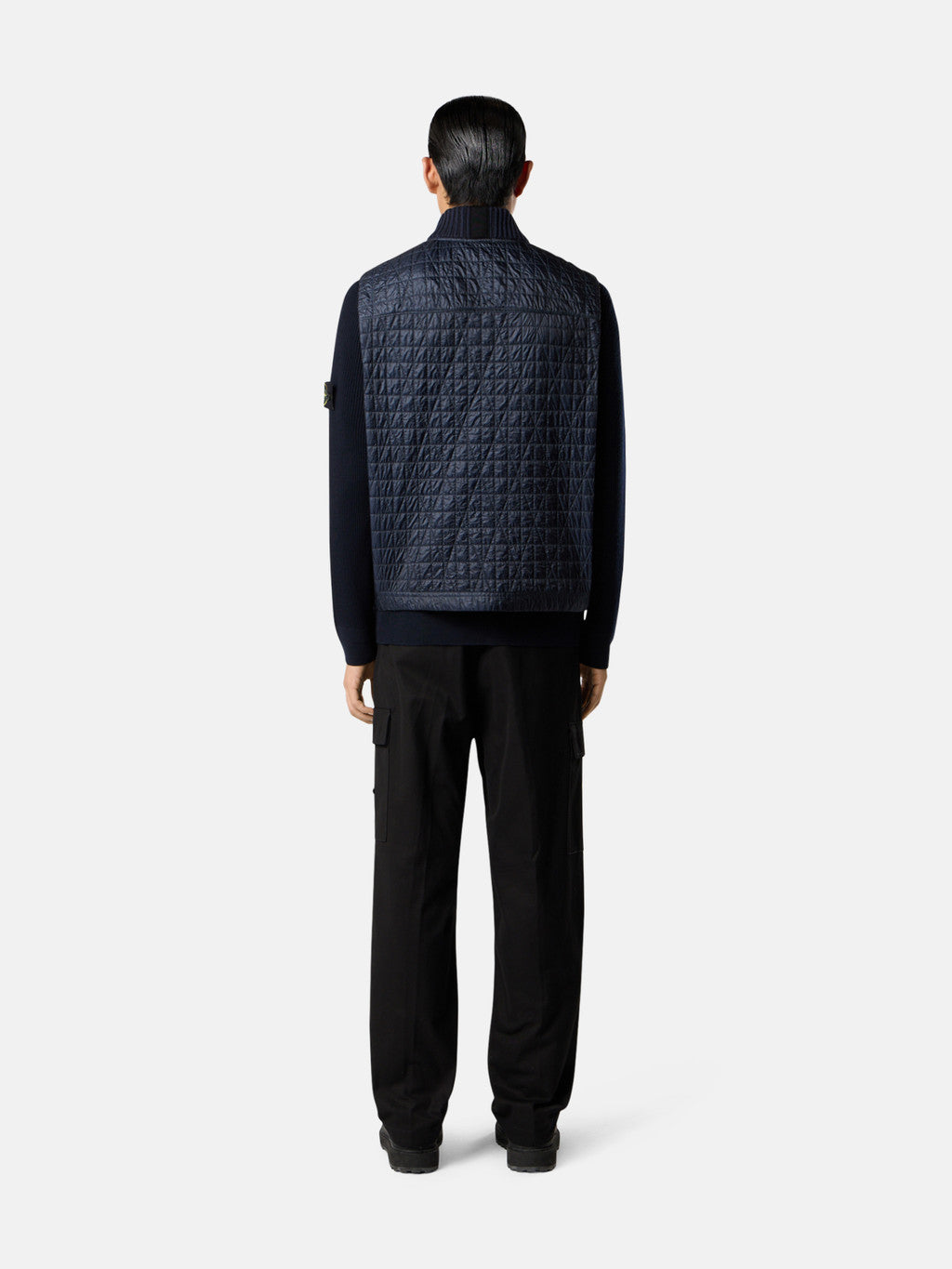 Padded vest in a light nylon rep with an ultra-tight weaving construction. The fabric features multiaxial quilting and an internal padding layer. The resin coating of its inner face makes it wind resistant and mildly water resistant. Due to the uneven penetration of colour into the resin-coated fabric, the dye bath lends a crinkled appearance to the surface. The addition of a special agent to the dye formula makes the piece anti-drop.