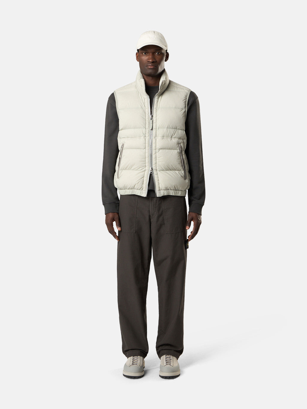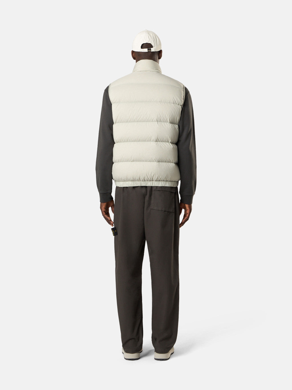 Down vest in a light stretch nylon single layer fabric undergoing a special weaving technique automatically creating the feather compartments directly from the loom. The seamless feather tunnels substantially increase the hold of the down. The finished garment is padded with direct injection with the finest feathers, specifically treated to resist garment dyeing. Garment dyed with the addition of a special anti-drop agent. RDS - Responsible Down Standard certified.
