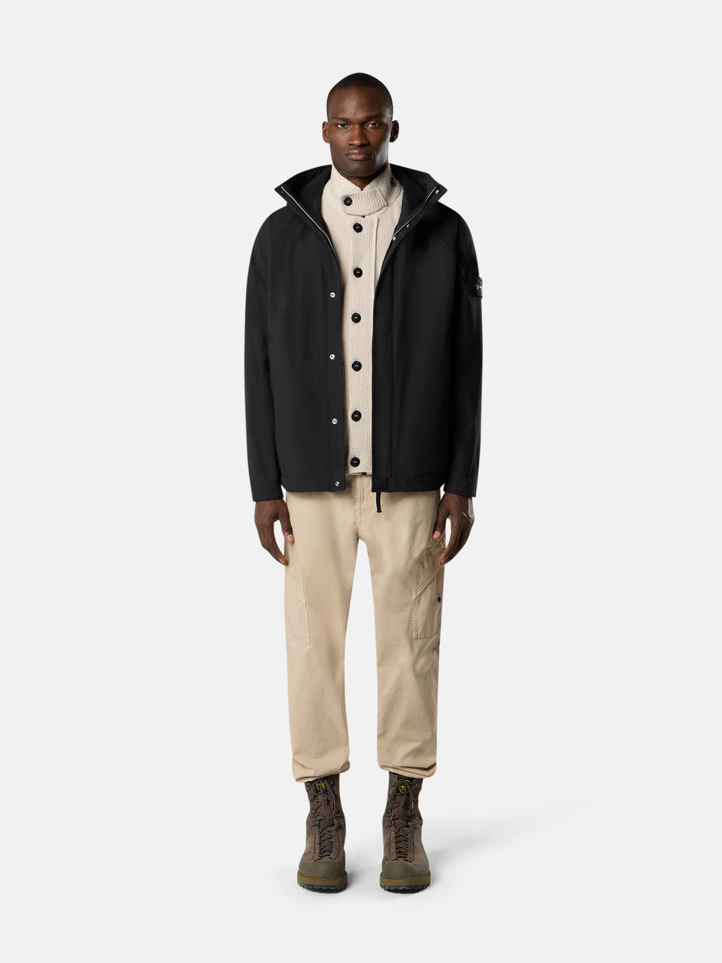 Light hooded parka in a 3-ply performance material with an 8000 MM water column. The polyester stretch canvas outer face is woven with yarns using e.dye Waterless Color System technology, an innovative yarn colour saturation system. The fabric is laminated to a breathable, wind- and water-resistant inner membrane, protected by a pile backing layer. The material's structure lends an exceptional level of flexibility and comfort to the garment.