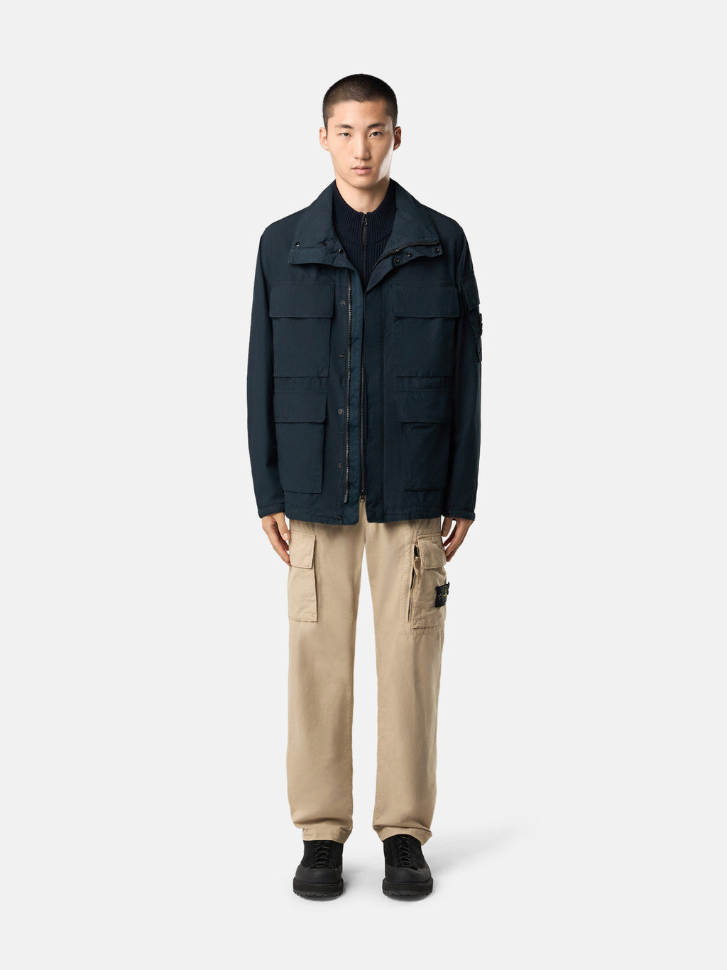 Field jacket in organic canvas weave cotton. The garment dyeing procedure with specific recipes and the addition of an anti-drop agent lends a unique appearance to the piece.
